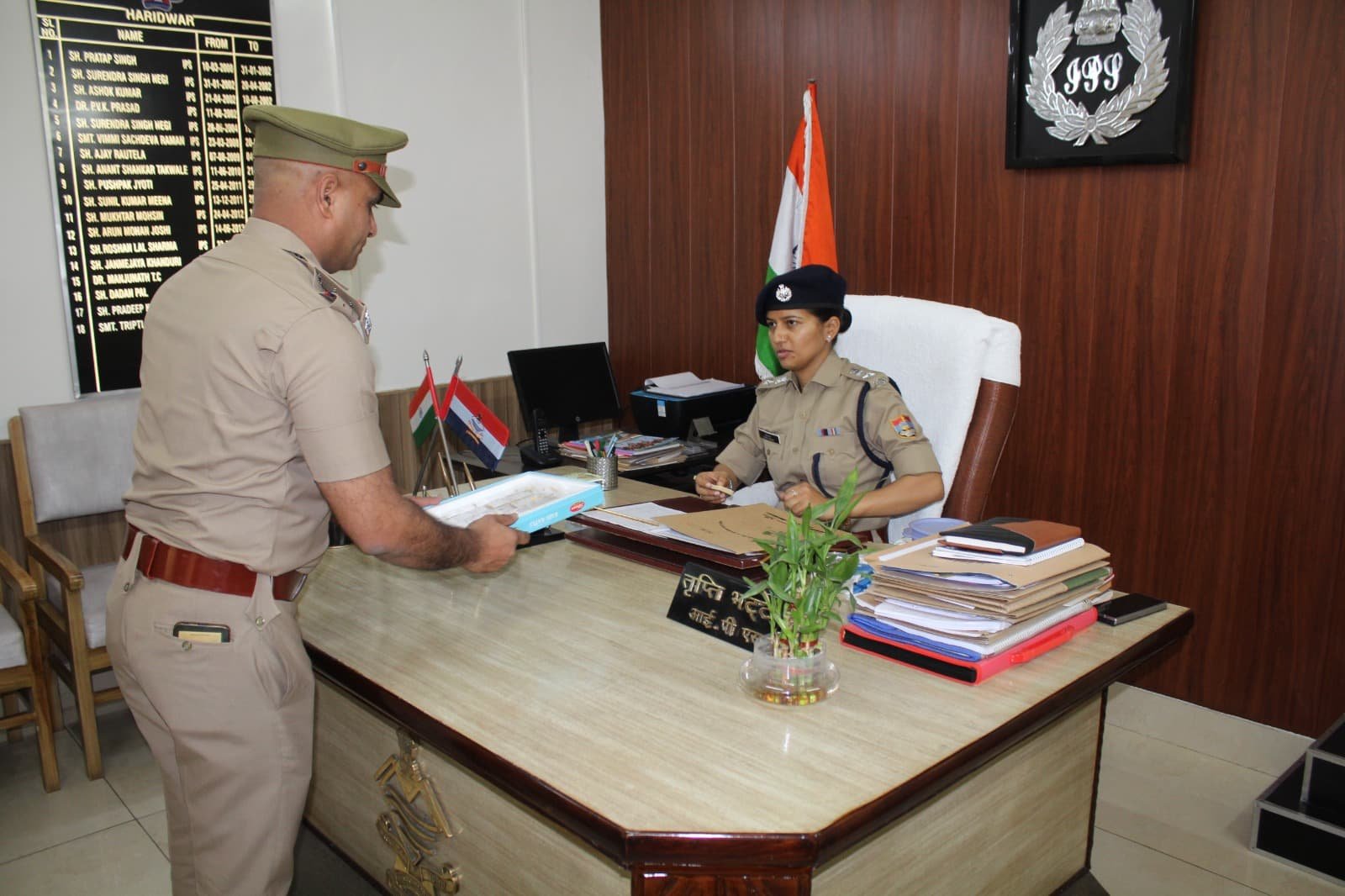 एसपी जीआरपी IPS तृप्ति भट्ट द्वारा थानाध्यक्ष जीआरपी देहरादून अशोक कुमार को उप निरीक्षक से निरीक्षक पद पर पदोन्नत होने पर कंधे पर तीसरा स्टार “बैच” लगाकर तालियों की गड़गड़ाहट के बीच शुभकामनायें दी गई। “पीपिंग सेरेमनी” के दौरान अशोक कुमार को तीसरा स्टार लगाए जाने पर पूरे जीआरपी स्टाफ ने उन्हें बधाई दी। अशोक कुमार वर्ष 2008 बैच के सीधी भर्ती के उपनिरीक्षक हैं जो काम की अच्छी जानकारी एवं अपने मधुर व्यवहार के कारण पूरे स्टाफ में लोकप्रिय हैं। मिष्ठान वितरण के दौरान समस्त जीआरपी पुलिस परिवार द्वारा अशोक कुमार को उनके अग्रिम सुनहरे भविष्य हेतु हार्दिक बधाई एवं शुभकामनायें दी गईं।