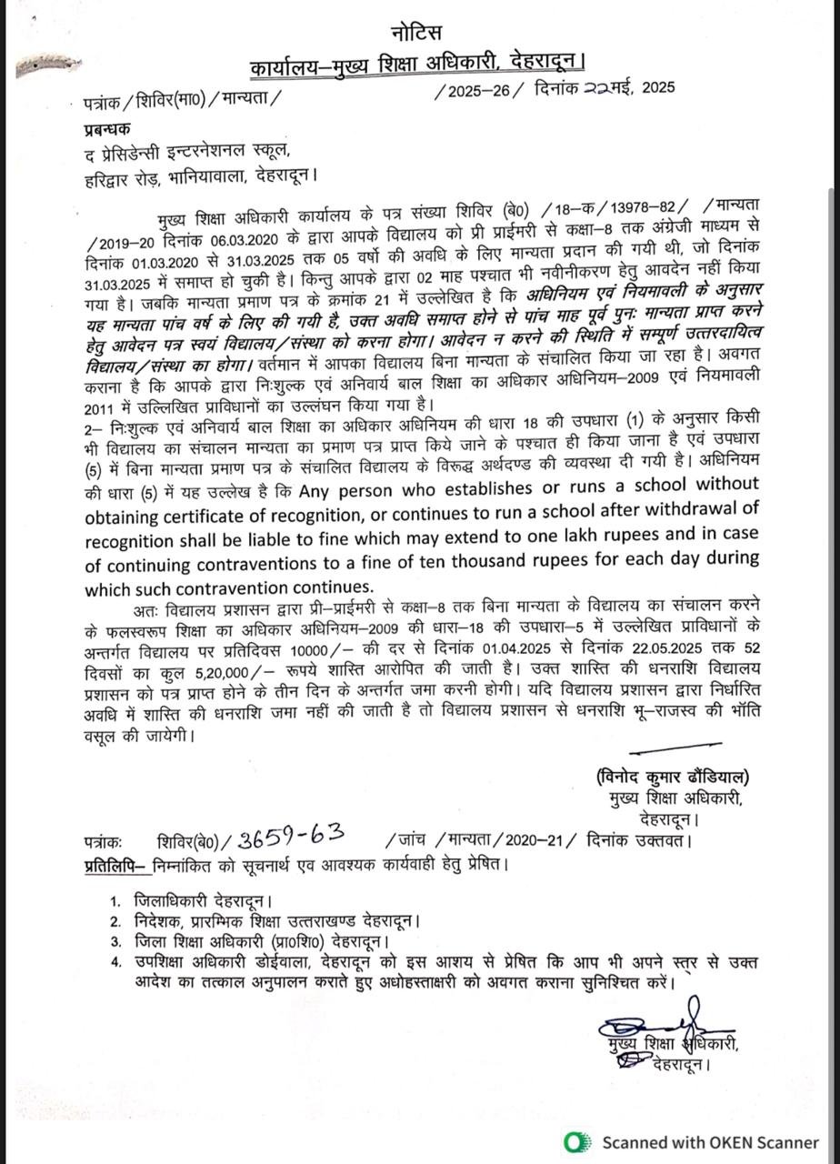 जिले के भानियावाला में अवस्थित प्रसिडेंसी इन्टरनेशनल स्कूल का फीस बढोतरी पर 100 से अधिक अभिभावकों द्वारा डीएम को शिकायत की गई थी। डीएम के निर्देश पर सीडीओ पर बुलाये जाने के उपरान्त भी स्कूल प्रबन्धन उपस्थित नही हो रहे थे। अभिलेखों की जांच करने पर पाया गया कि विद्यालय को प्री प्राईमरी से कक्षा 8 तक अंग्रेजी माध्यम से मार्च 2020 से मार्च 2025 तक की अवधि 5 वर्ष के लिए मान्यता प्रदान की गई थी, जबकि स्कूल प्रबन्धन द्वारा मान्यता नवीनीकरण के लिए अभी तक आवेदन नही किया गया है, जिस पर जिला प्रशासन द्वारा द प्रसिडेंसी विद्यालय पर प्री-प्राईमरी से कक्षा-8 तक बिना मान्यता के विद्यालय का संचालन करने के फलस्वरूप शिक्षा का अधिकार अधिनियम-2009 की धारा-18 की उपधारा-5 में उल्लेखित प्राविधानों के अन्तर्गत विद्यालय पर प्रतिदिवस 10,000/- की दर से दिनांक 1 अपै्रल 2025 से 22 मई 2025 तक 52 दिवसों का कुल 5,20,000/- रूपये शास्ति आरोपित कर दी गई है। उक्त शास्ति की धनराशि विद्यालय प्रशासन को पत्र प्राप्त होने के तीन दिन के अन्तर्गत जमा करने के निर्देश दिए हैं। यदि विद्यालय प्रशासन द्वारा निर्धारित अवधि में शास्ति की धनराशि जमा नहीं की जाती है तो विद्यालय प्रशासन से धनराशि भू-राजस्व की भाँति वसूल की जायेगी।