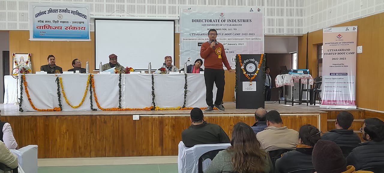टिहरी : स्टार्टअप नीति के अंतर्गत धर्मानंद उनियाल राजकीय महाविद्यालय नरेंद्रनगर में दो दिवसीय बूट कैम्प का आयोजन किया जा रहा है। वाणिज्य और प्रबंधन विभाग के तत्वावधान में भारतीय प्रबंधन संस्थान और उद्योग निदेशालय के सहयोग से आयोजित स्टार्ट-अप बूट कैम्प में आज पहले दिन युवाओं के नवीन अभिवन सोच को हर प्रकार की मदद मुहैया कराने के लिए बूट कैम्प का आयोजन कॉलेज के छात्र छात्राओं के साथ ही टिहरी जिले के युवाओं के लिए आयोजित किया गया जिसमें भारतीय प्रबंधन संस्थान के प्रो0 कुनाल गांगुली, प्रो0 वैभव भमोरिया और प्रो0 मृदुल माहेश्वरी ने बतौर विशेषज्ञ युवाओं को प्रशिक्षण दिया और उद्यमिता के गुर सिखाए।
