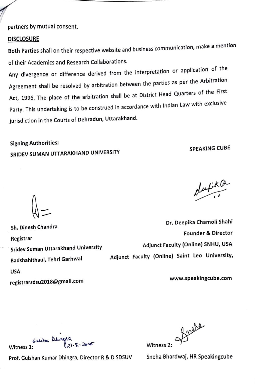 विश्वविद्यालय के कुलपति प्रोफेसर एनके जोशी द्वारा बताया गया कि विश्वविद्यालय के अनुसंधान एवं विकास प्रकोष्ठ द्वारा पिछले दो वर्षों में लगभग 25 अंतरराष्ट्रीय व राष्ट्रीय संस्थानों से (MOU) समझौता हस्ताक्षर किए गए हैं व इसी क्रम में विगत मार्च 2025 में स्पीकिंगक्यूब संस्था के सहयोग से विश्वविद्यालय द्वारा वर्चुअल माध्यम से मनोवैज्ञानिक मुद्दे: हस्तक्षेप और प्रबंधन विषय पर एक अंतरराष्ट्रीय सम्मेलन आयोजित किया गया। उन्होंने बताया कि आने वाले सितंबर 2025 से विश्वविद्यालय व स्पीकिंगक्यूब संस्था द्वारा एक फैकेल्टी डेवलपमेंट कार्यक्रम का आयोजन किया जा रहा है जिसका प्रदेश व देश के प्राध्यापकों को लाभ प्रदान होगा।