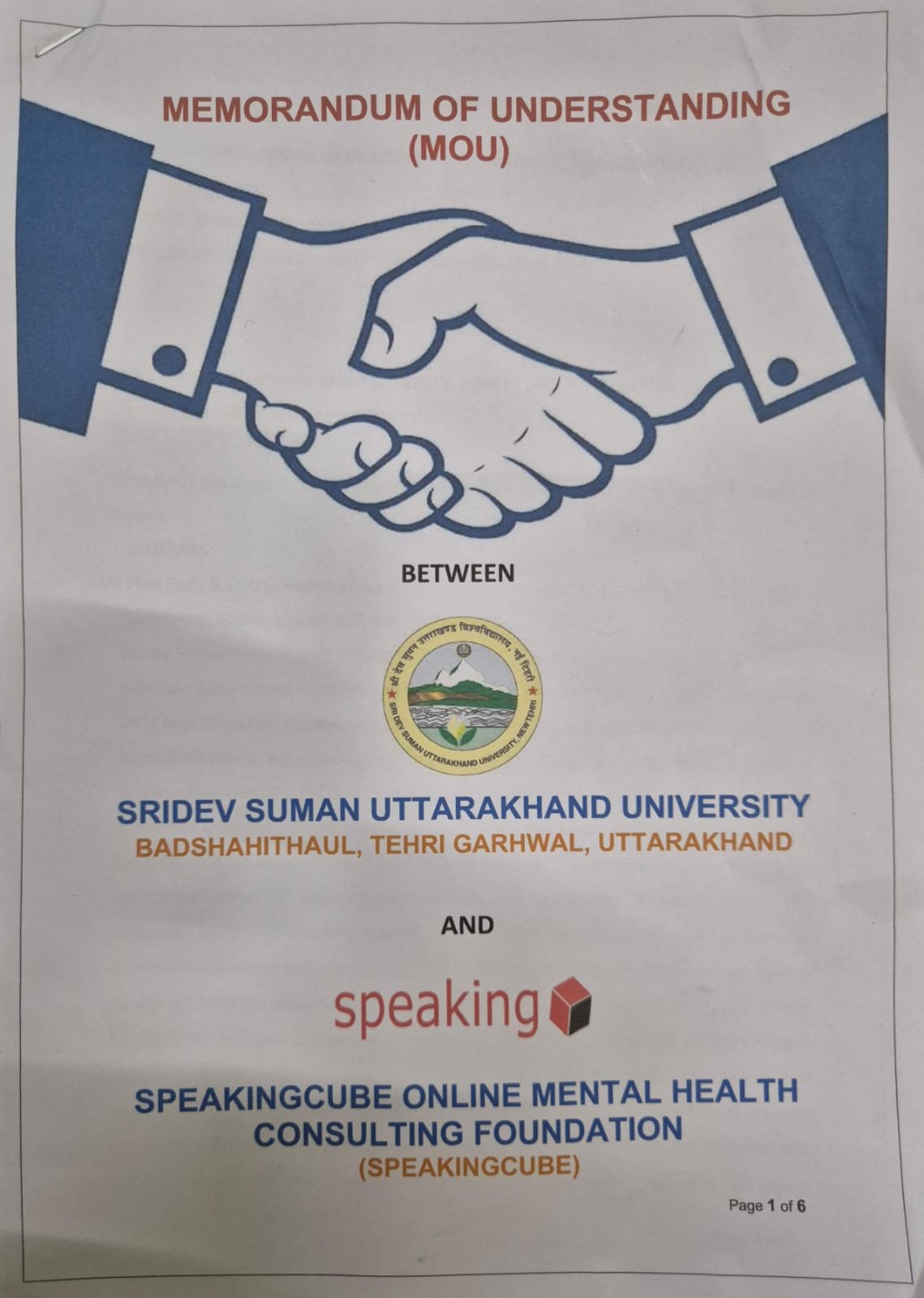 टिहरी : श्रीदेव सुमन उत्तराखंड विश्वविद्यालय, बादशाहीथौल, टिहरी गढ़वाल और स्पीकिंगक्यूब ऑनलाइन मेंटल हेल्थ कंसल्टिंग फाउंडेशन के बीच एक महत्वपूर्ण समझौता ज्ञापन (एमओयू) पर दिनांक 21 अगस्त 2025 को हस्ताक्षर किए गए। इस समझौते का उद्देश्य छात्रों और समाज में मानसिक स्वास्थ्य जागरूकता, शैक्षणिक शोध, और सामाजिक उद्यमिता को नई दिशा देना है।
