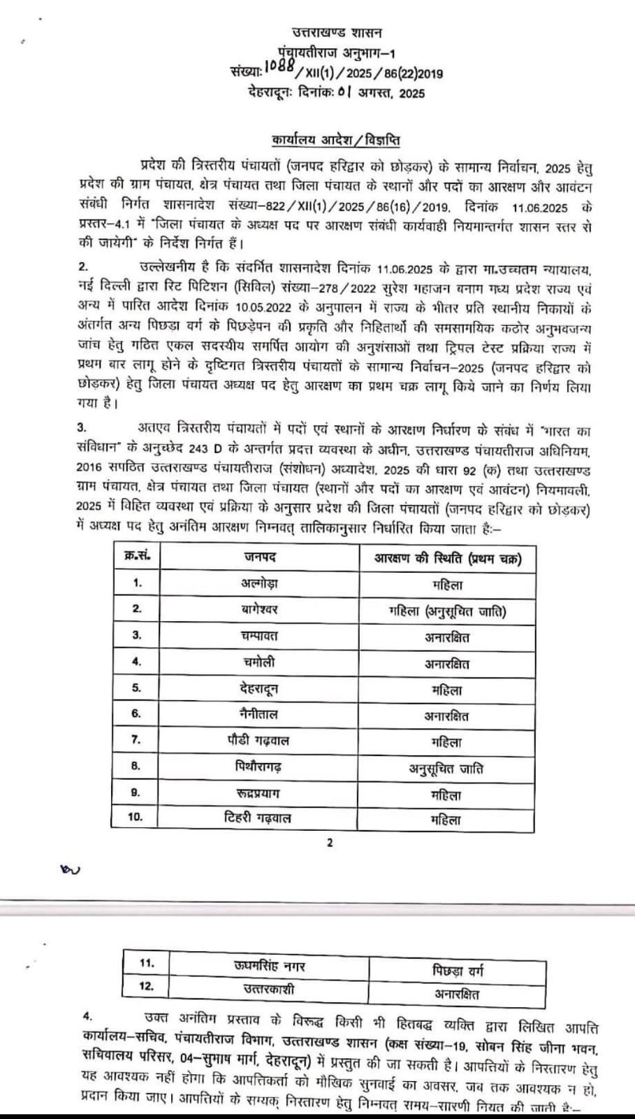उत्तराखंड पंचायत चुनाव 2025 : आरक्षण चक्र लागू, 12 जिलों के लिए जिला पंचायत अध्यक्ष पद आरक्षित