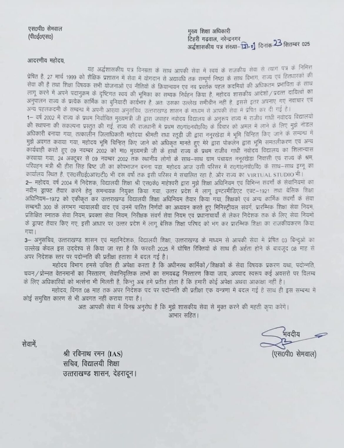 देहरादून: उत्तराखण्ड के शिक्षा विभाग में लंबे समय तक समर्पित सेवा देने वाले एक वरिष्ठ अधिकारी ने पदोन्नति में देरी और प्रशासनिक उदासीनता के चलते त्यागपत्र दे दिया है। अपने अर्द्धशासकीय पत्र में अधिकारी ने 27 मार्च 1999 से शुरू हुई अपनी सेवा के दौरान शिक्षा विभाग, राज्य और हितधारकों के लिए पूर्ण निष्ठा के साथ कार्य करने का उल्लेख किया। उन्होंने शिक्षा योजनाओं और नीतियों के प्रभावी क्रियान्वयन के साथ-साथ नवाचारों में महत्वपूर्ण योगदान दिया।