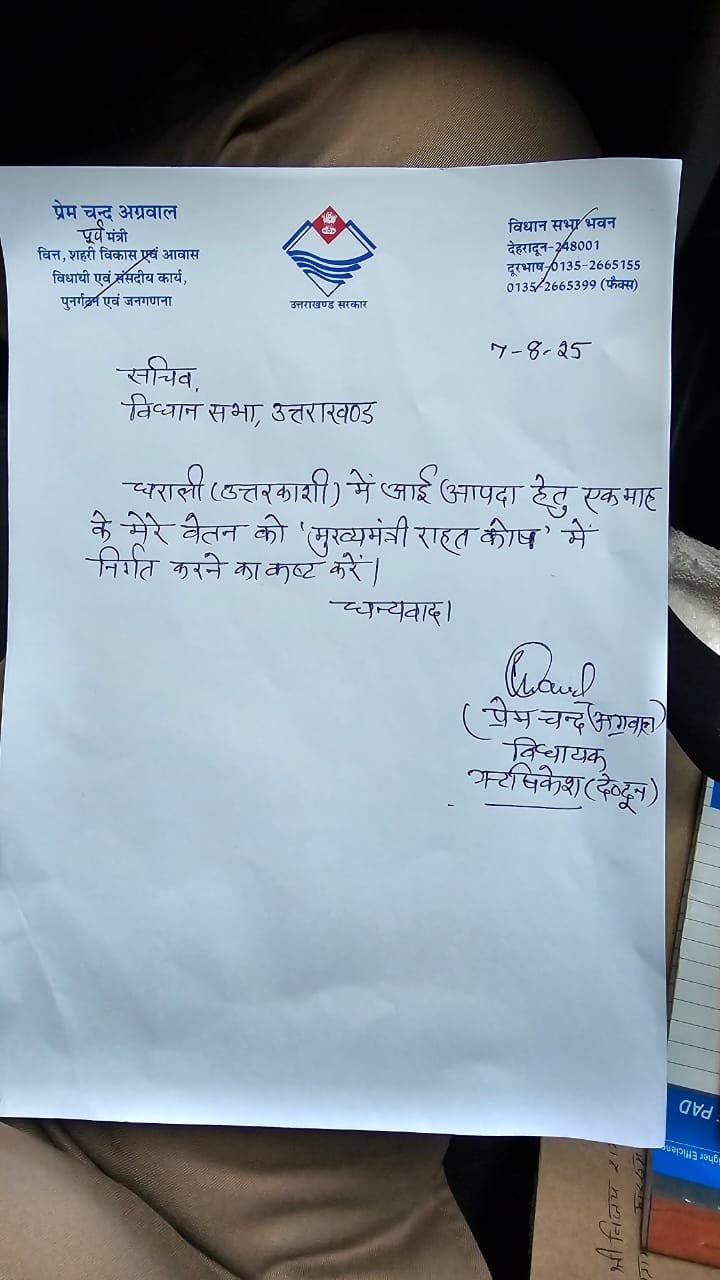 ऋषिकेश : पूर्व मंत्री डॉ प्रेम चंद अग्रवाल ने उत्तरकाशी जनपद के धराली गांव में आई आपदा के दृष्टिगत मुख्यमंत्री राहत कोष में अपने एक माह का वेतन देने की घोषणा की है। ऐसा करने पर पूर्व मंत्री डॉ प्रेमचंद अग्रवाल ने एक बार फिर यह जता दिया है कि उत्तराखंड और यहाँ के लोग उनके दिल में बसते हैं तथा यहाँ के लोगों की पीड़ा को अपना मानते हैं। इस अवसर पर डॉ अग्रवाल ने कहा है कि उत्तरकाशी के धराली गांव में आई भीषण आपदा से जन-धन की हानि अत्यंत दुखद एवं पीड़ादायक है।