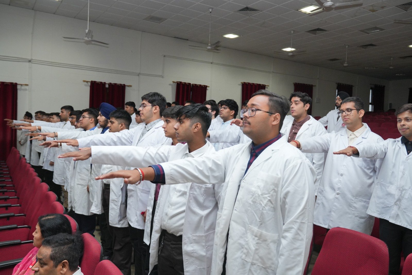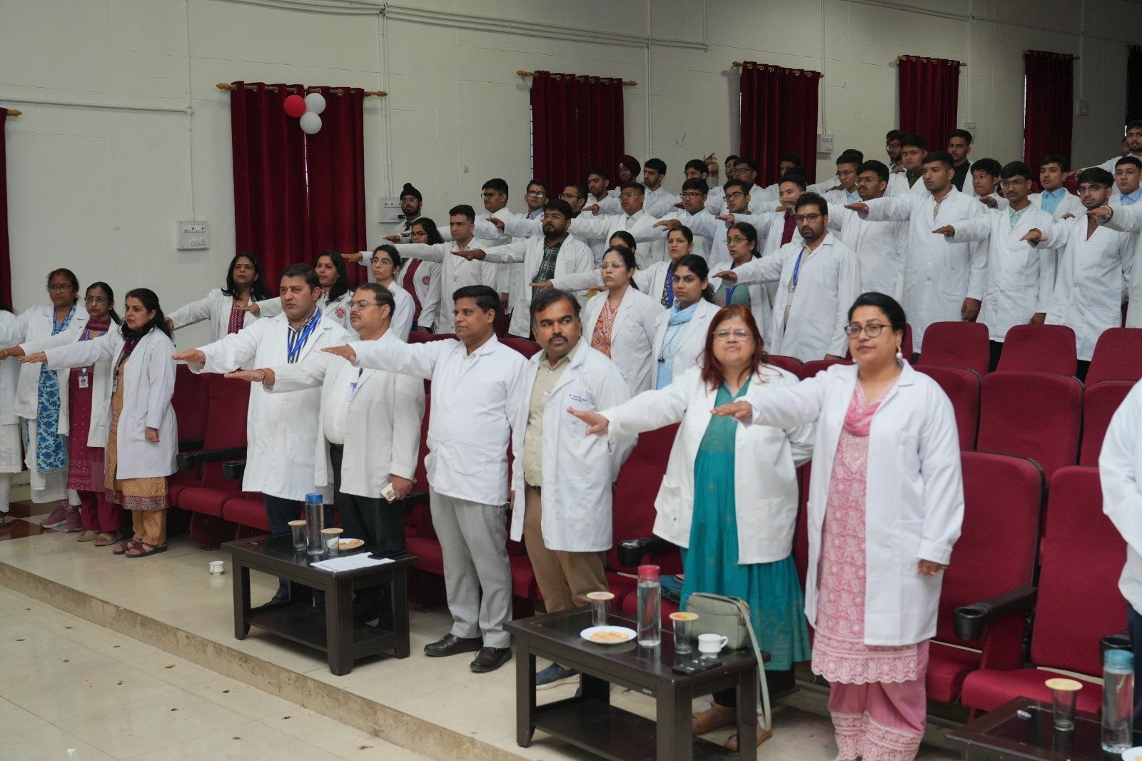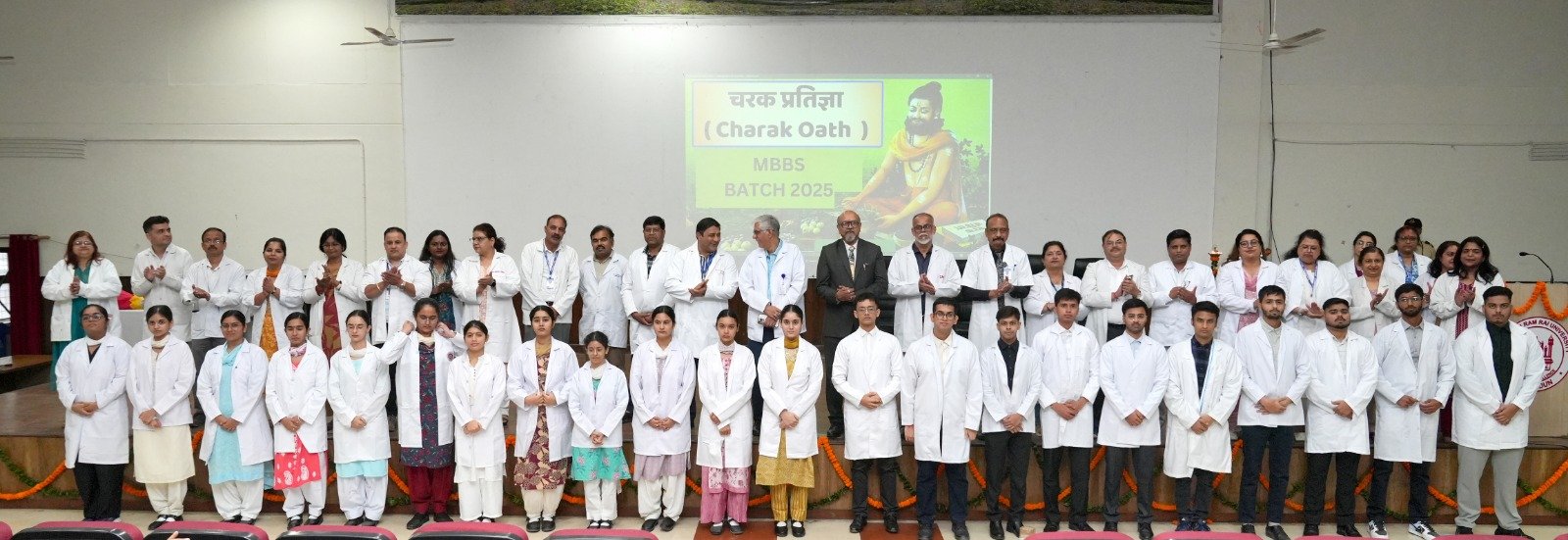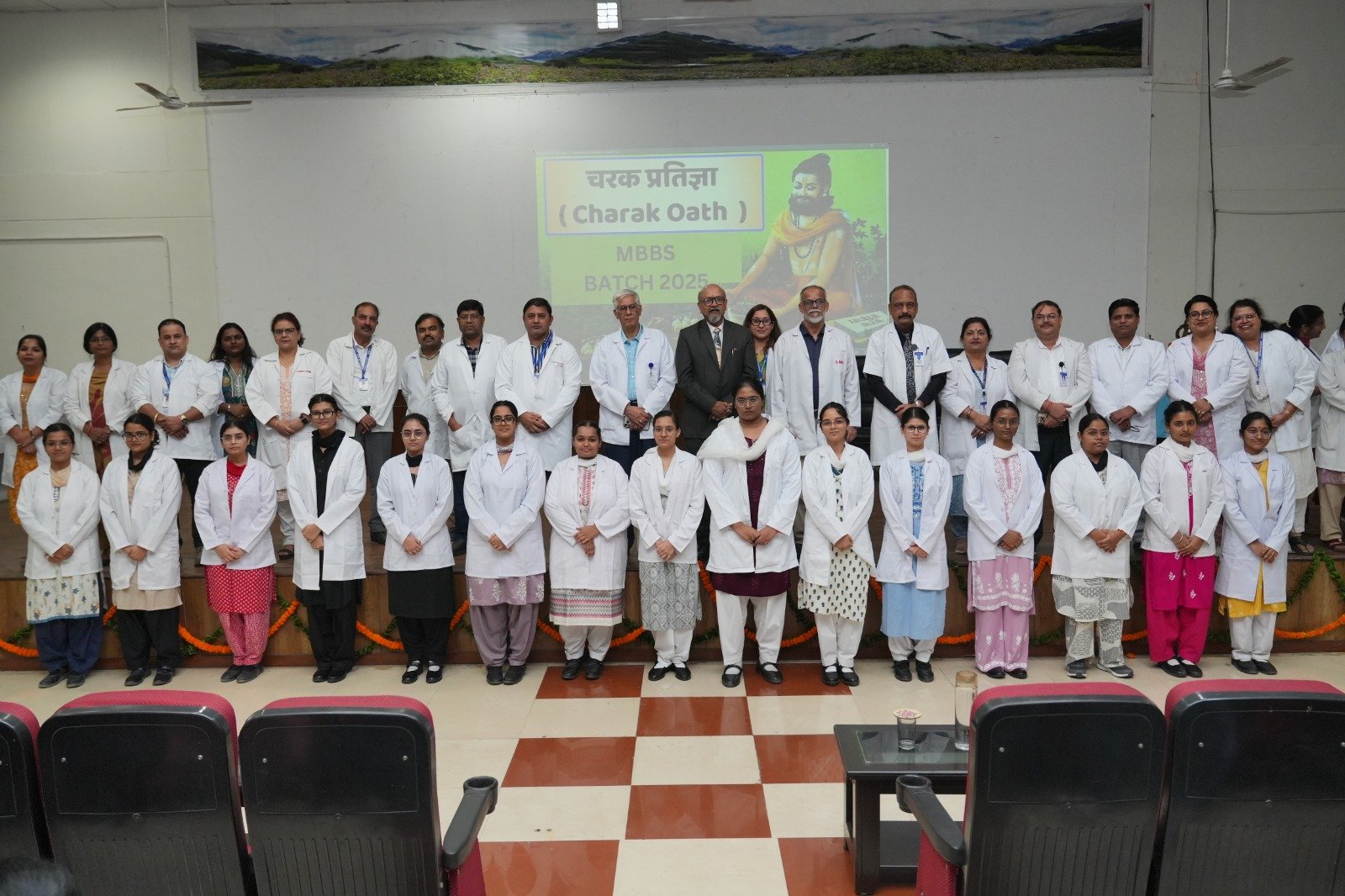 इस वाईट कोट सैरेमनी व चरक शपथ मे 134 नव आगुंतक (फ्रैशर) छात्र-छात्राओं ने बडे़ उत्साह के साथ प्रतिभाग किया। कार्यक्रम मे मंच संचालन डॉ. वाणी शर्मा द्वारा किया गया। इस अवसर पर डॉ. सुमन बाला, डॉ. ललित कुमार वाष्णेय, डॉ. तारिख मसूद व विभिन्न विभागो के विभागाध्यक्ष, फैक्लटी सदस्य व छात्र-छात्राओं के अभिभावकगण भी उपस्थित थे।
